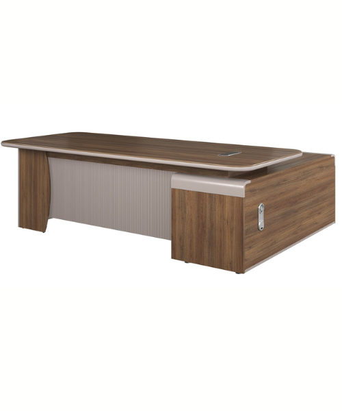 Bàn lãnh đạo LUXURY SUPREME S7 chất liệu gỗ sơn PU+ melamin. Kiểu dáng hiện đại, sang trọng, góc cạnh mặt bàn được bo tròn đều, tủ phụ liền bàn có khoang ngăn kéo và cánh mở, ngăn kéo sử dụng khóa cảm ứng. yếm bàn sử dụng ốp song chỉ cầu lõm, tủ phụ nóc sơn uốn cạnh. Mặt bàn dùng nắp đi dây hiện đại, khắc logo The One